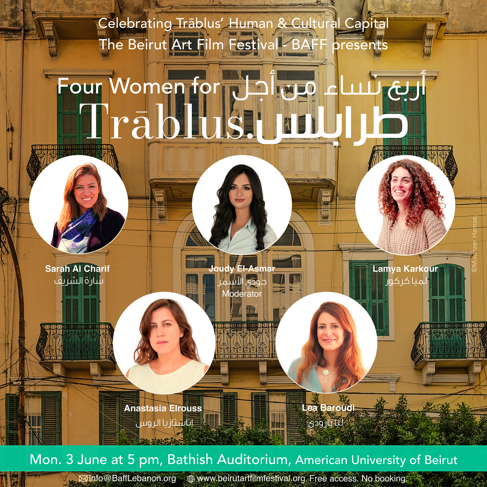Four Women for Trāblus is a panel meeting with Sarah Al Charif, Lamya Karkour, Anastasia Elrouss and Lea Baroudi, founders and directors of 4 Tripoli-based NGOs: Ruwwad Al Tanmeya, Tri-Pulley, Warchée and March.