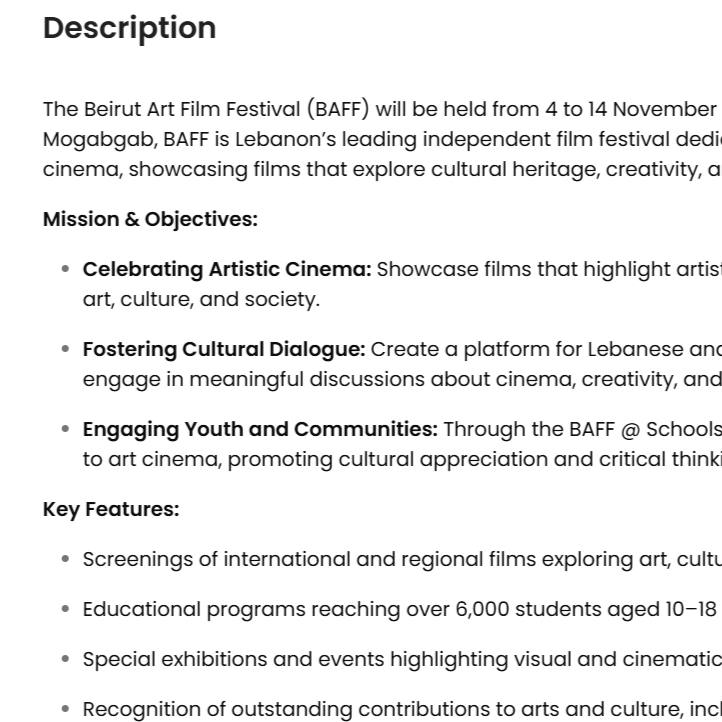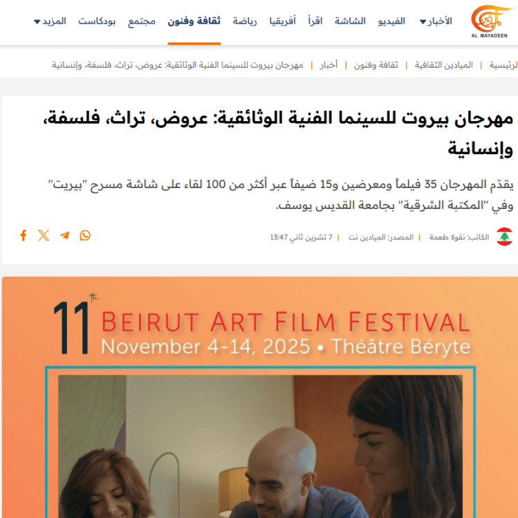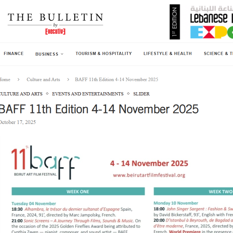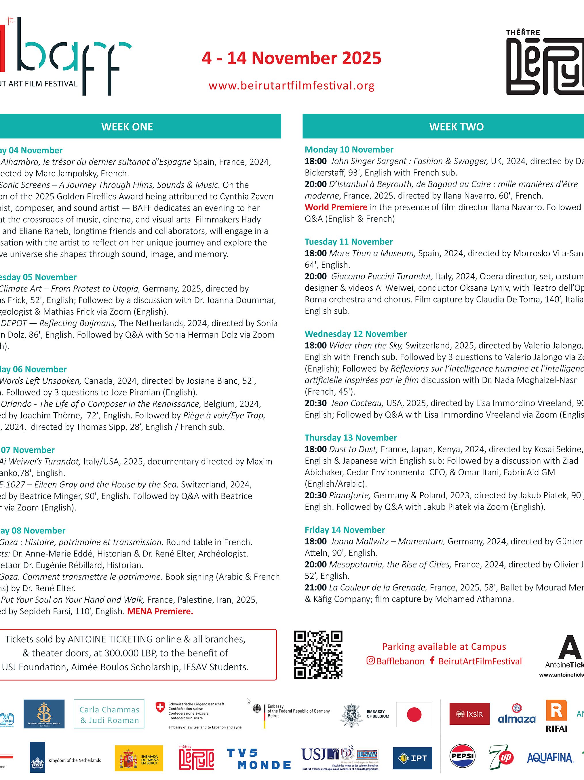 The Beirut Art Film Festival โ BAFF, continues its march alongside the world’s artists and filmmakers, more committed than ever to the fundamental values โโof our shared humanity. In a world saturated with fakes, where endless wars, climate change, environmental crises, the silent revolution of artificial intelligence, and persistent threats to human rights fuel the great concerns of our time, the BAFF gives voice to the directors, artists, and speakers of this 11th edition, who place humanity at the heart of creation, as an act of faith and hope.