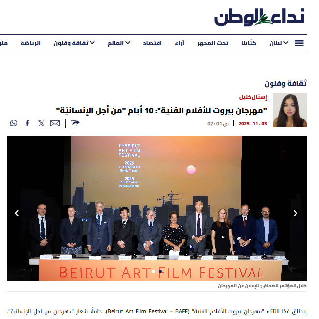 Le Beirut Art Film Festival โ BAFF, continue sa marche aux cรดtรฉs des artistes et cinรฉastes du monde, plus engagรฉ que jamais en faveur des valeurs fondamentales de notre humanitรฉ partagรฉe. Dans un monde saturรฉ de faux, oรน les guerres interminables, le dรฉrรจglement climatique, les crises environnementales, la rรฉvolution silencieuse de lโintelligence artificielle, les menaces persistantes sur les droits humains nourrissent les grandes inquiรฉtudes de notre รฉpoque, le BAFF donne la parole aux rรฉalisateurs, aux artistes et aux confรฉrenciers de cette 11e รฉdition, qui placent lโhumain au cลur de la crรฉation, comme un acte de foi et dโespoir.