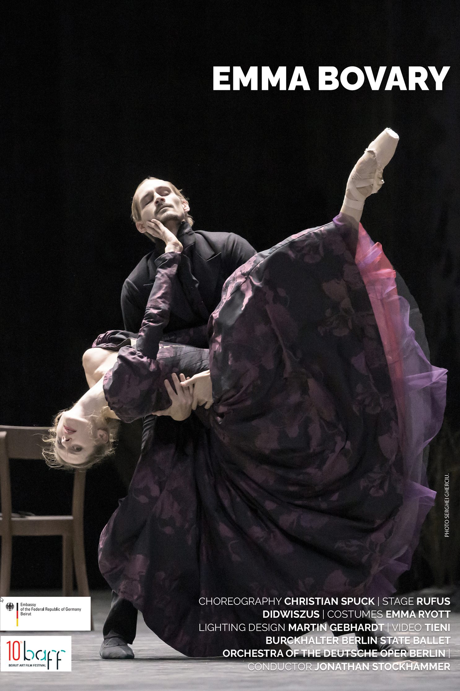 هو عملٌ مقتبسٌ من رائعة غوستاف فلوبير إيما بوفاري، في عرض باليه لكريستيان سبوك، الراقص ومصمم الرقص الألماني الذي يقود فرقة ستاتس باليه المرموقة في برلين. يرى سبوك في إيما بوفاري تجسيدًا لرغبةٍ سائدة في العالم في إعادة ابتكار الذات، وهو الموضوع الذي يستكشفه من خلال الرقص. فيمزج مصمم الرقصات بين الباليه الكلاسيكي وعناصر معاصرة مثل الفيديو، سعيًا إلى إبراز جانب الحداثة الخالد في هذه الرواية. ترافق الموسيقى، التي تبرع في المزج بين الماضي والحاضر، هذه الرحلة بدقةٍ، بينما تضيف الأزياء، التي تلعب على وتر التناقضات مع الديكور، من الثراء البصري لهذا العمل الراقص. والنتيجة هي لوحة باليه ملؤها الابتكار، تُظهر كيف يخرج الأدب من بين الصفحات متحركًا.