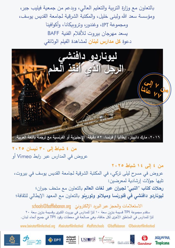 بعد نجاحه سنة 2023 بعرض فيلم معركة الأرز، يعود مهرجان بيروت للأفلام الفنية BAFF – عام 2025 إلى جميع المدارس في لبنان، الخاصة والعامة، بالتعاون مع وزارة التربية والتعليم العالي وبدعم من جمعية فيليب جبر، ومؤسسة سعد الله ولبنى خليل، والمكتبة الشرقية لجامعة القديس يوسف، ومجموعة IPT، وغندور، وتروبيكانا، وأكوافينا بفيلم ليوناردو دافنشي. الرجل الذي أنقذ العلم،