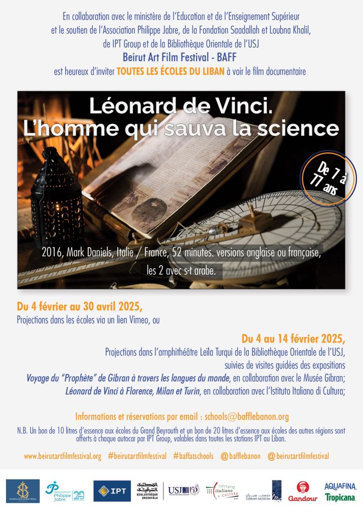 Après le succès du BAFF @ Schools 2023 avec la projection du film La Bataille du cèdre, le Beirut Art Film Festival – BAFF revient en 2025 dans toutes les écoles du Liban, privées et publiques, en collaboration avec le Ministère de l’Education et de l’Enseignement Supérieur et avec le soutien de l’Association Philippe Jabre, de la Fondation Saadallah et Loubna Khalil, de la Bibliothèque Orientale de l’USJ, de IPT Group, de Gandour, de Tropicana et Aquafina avec le film Léonard de Vinci. L’homme qui sauva la science, 2016, Mark Daniels, Italie / France, 52 minutes, Anglais ou Français avec s-t. Arabe. C’est gratuit et c’est inspirant pour les écoliers!