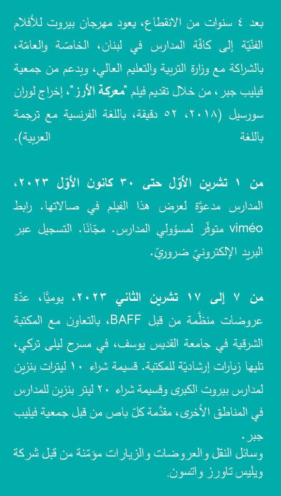 Du 7 au 17 novembre 2023, chaque jour, plusieurs séances sont organisées par le BAFF, en collaboration avec la Bibliothèque Orientale de l’Université Saint-Joseph, dans l’amphithéâtre Leïla Turquie, et suivies de visites guidées de la Bibliothèque. Un bon de 10 litres d’essence aux écoles du Grand Beyrouth et un bon de 20 litres d’essence aux écoles des autres régions sont offerts pour chaque autocar par l’Association Philippe Jabre.