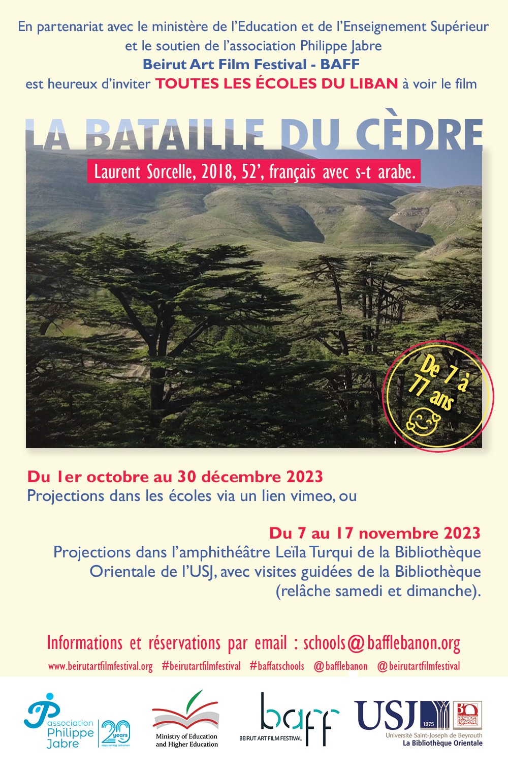 After 4 years of interruption, the Beirut Art Film Festival returns to all schools in Lebanon, private and public, in partnership with the Ministry of Education and Higher Education and the support of the Philippe Jabre association with the documentary film La bataille du cèdre, directed by Laurent Sorcelle (2028, 52′ French with Arabic s-t).