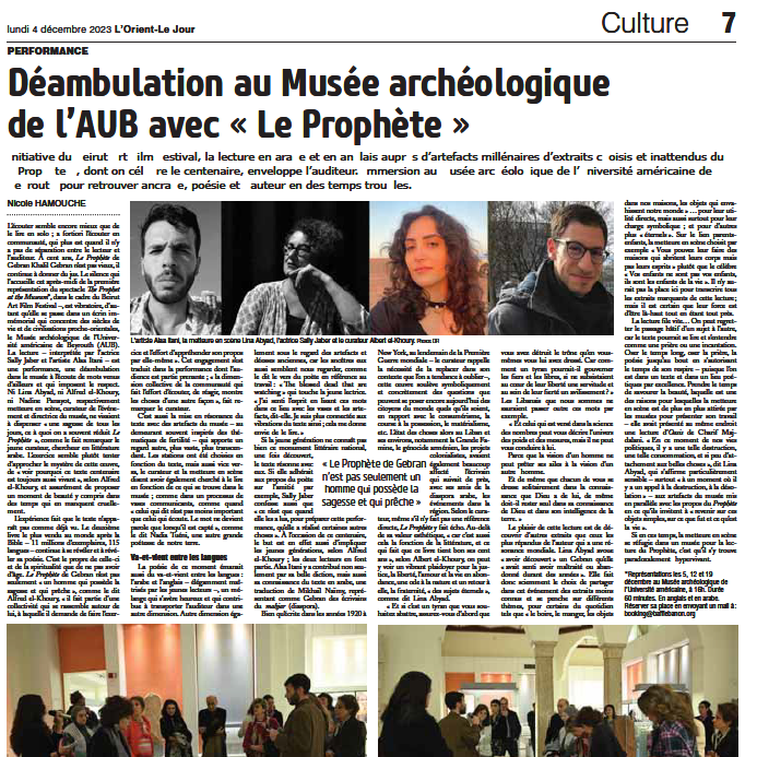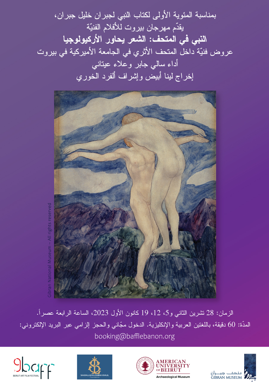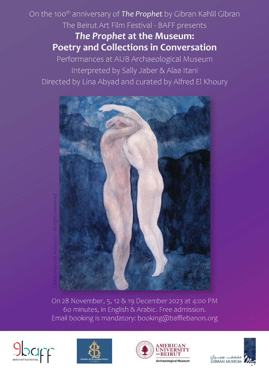 These performances propose to explore The Prophet’s rootedness in the cultures of the Eastern Mediterranean and its kinship with the books of the Antique World, the biblical as well as the Arab-Islamic Sufi traditions. This is another way to probe the universality of Gibran’s book and trace its rich genealogy. By bringing The Prophet into an archaeological museum, stage director Lina Abyad and centennial curator Alfred El Khoury propose to approach the book as a timeless document and to initiate a conversation between its 26 chapters and various sections and collections of the museum.