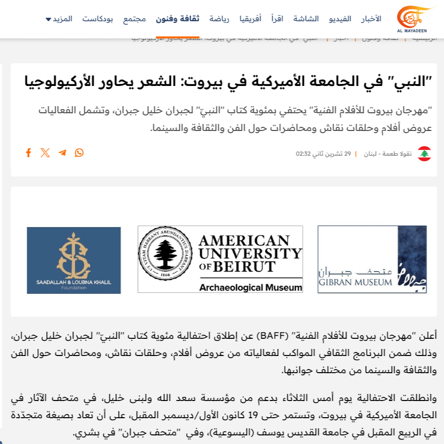 يقترح هذا العرض قراءةَ كتاب النبيّ في علاقته بثقافات شرق المتوسّط وكتب العالم القديم، وهو بذلك يهدف إلى إضفاء بُعدٍ جديد على عالميّة كتاب جبران وجذوره الأدبيّة والحضاريّة. فمن خلال “دعوة” النبيّ إلى متحفٍ متخصّص بعِلْم الآثار، وتحديدًا آثار الشرق الأوسط من مصر حتّى إيران، ومنذ العصر الحجريّ حتّى القرن التاسع عشر، يقدّم هذا العرض الكتابَ كوثيقة عابرة للأزمنة والثقافات.