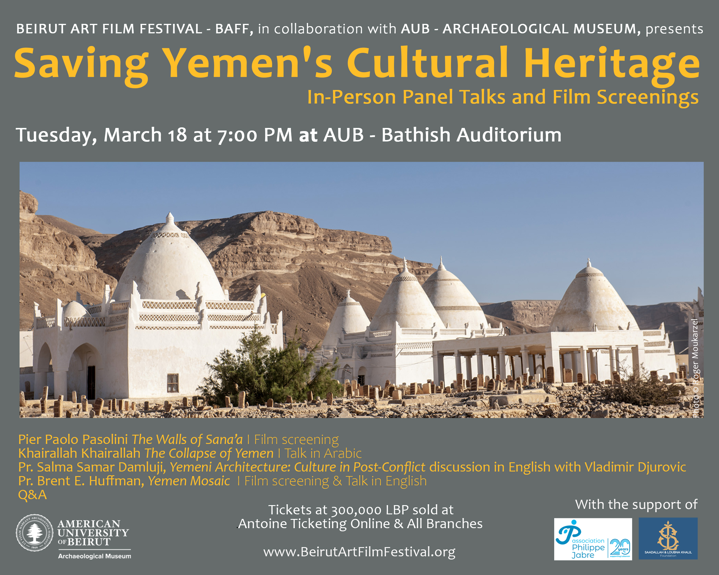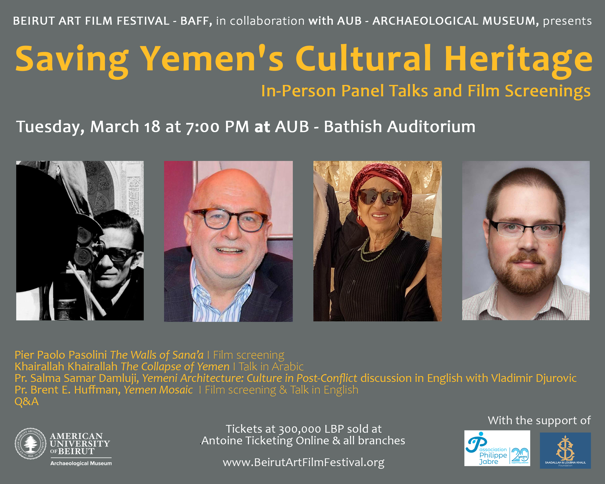 Cette séance est réalisée avec le soutien de l’Association Philippe Jabre, de la Fondation Saadallah et Loubna Khalil, de la Faculté des Lettres et des Sciences Humaines – FLSH et de l’Institut d’Etudes Scéniques et Audiovisuelles – IESAV de l’Université Saint Joseph de Beyrouth.